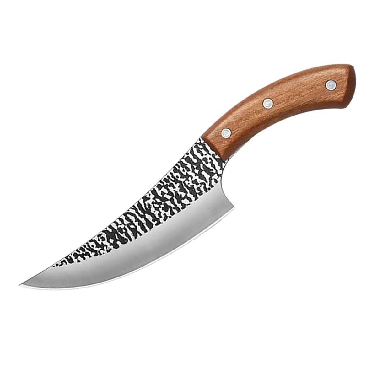Cuchillo carnicero ideal para tallar, rebanar y deshuesar carne con mayor control. Cuenta con hoja de acero inoxidable y acabado tipo forjado martillado para resistencia y buen filo, además de mango de madera ergonómico con remaches que brinda un agarre firme y cómodo en cocina o parrilla.