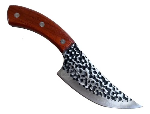 Cuchillo carnicero ideal para tallar, rebanar y deshuesar carne con mayor control. Cuenta con hoja de acero inoxidable y acabado tipo forjado martillado para resistencia y buen filo, además de mango de madera ergonómico con remaches que brinda un agarre firme y cómodo en cocina o parrilla.