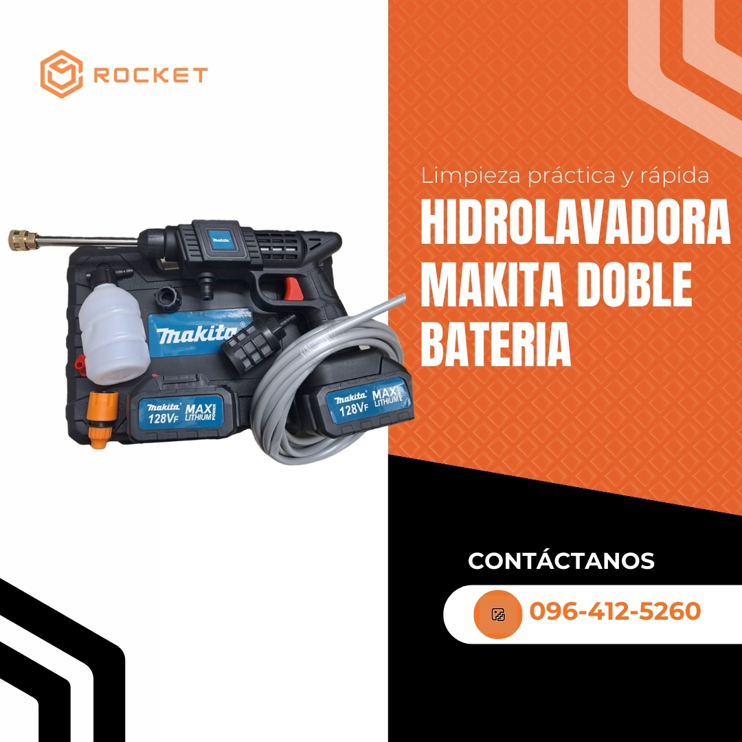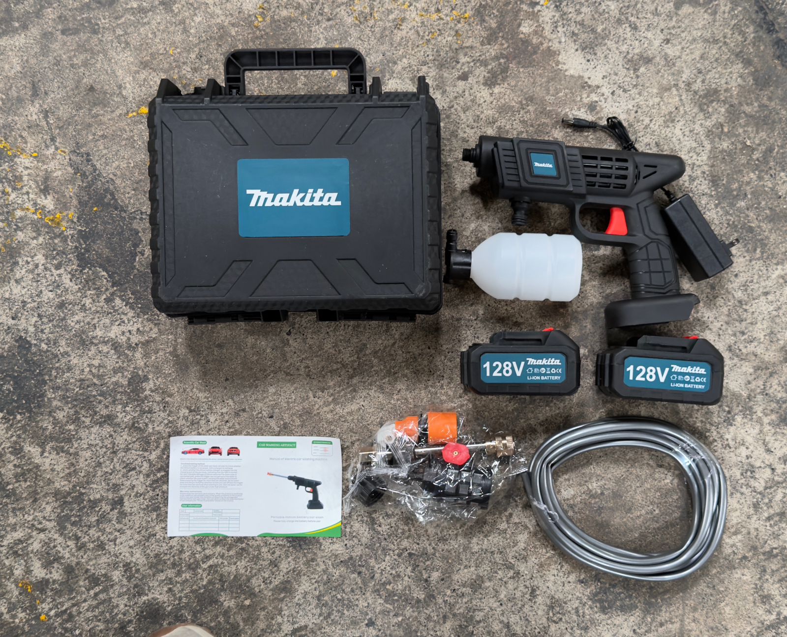 Hidrolavadora inalámbrica portátil tipo Makita (pistola de presión) ideal para lavar autos, motos, patios y ventanas sin necesidad de toma de agua fija. Viene en kit completo con maletín, manguera, depósito/vaso espumador, accesorios y 2 baterías recargables, para una limpieza práctica y rápida en cualquier lugar.