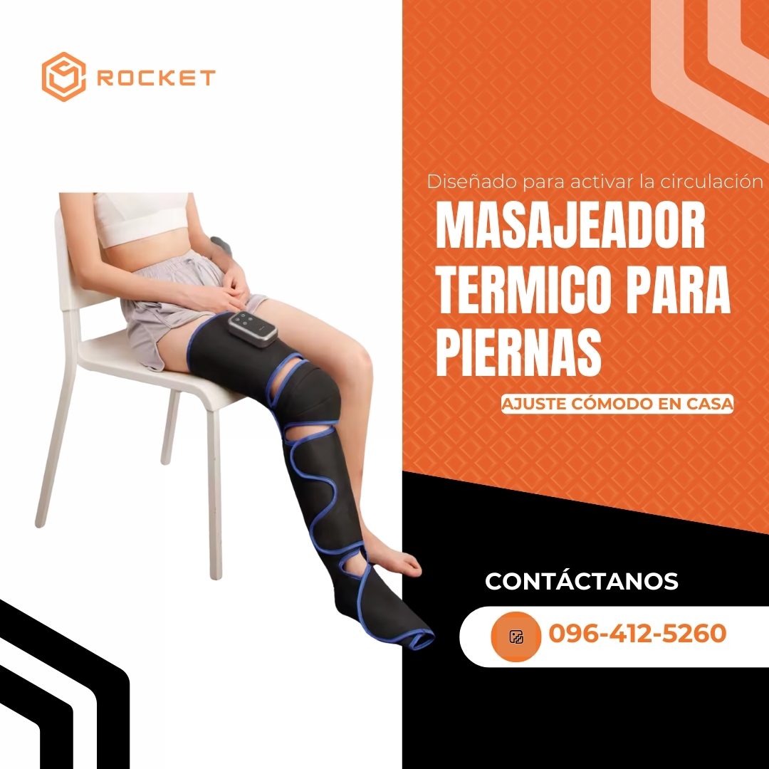 Masajeador de piernas por compresión de aire tipo “bota” que cubre muslo, rodilla, pantorrilla y pie, diseñado para activar la circulación, aliviar cansancio, tensión y pesadez después de estar mucho tiempo de pie o sentado. Incluye controlador electrónico para ajustar modos e intensidad y se adapta con correas para un ajuste cómodo en casa.