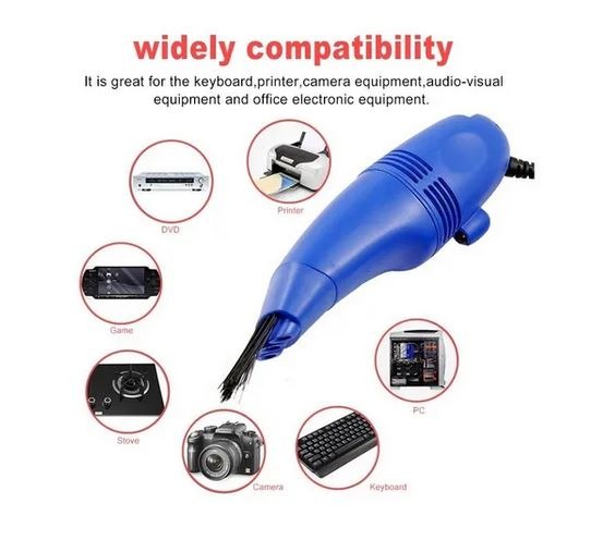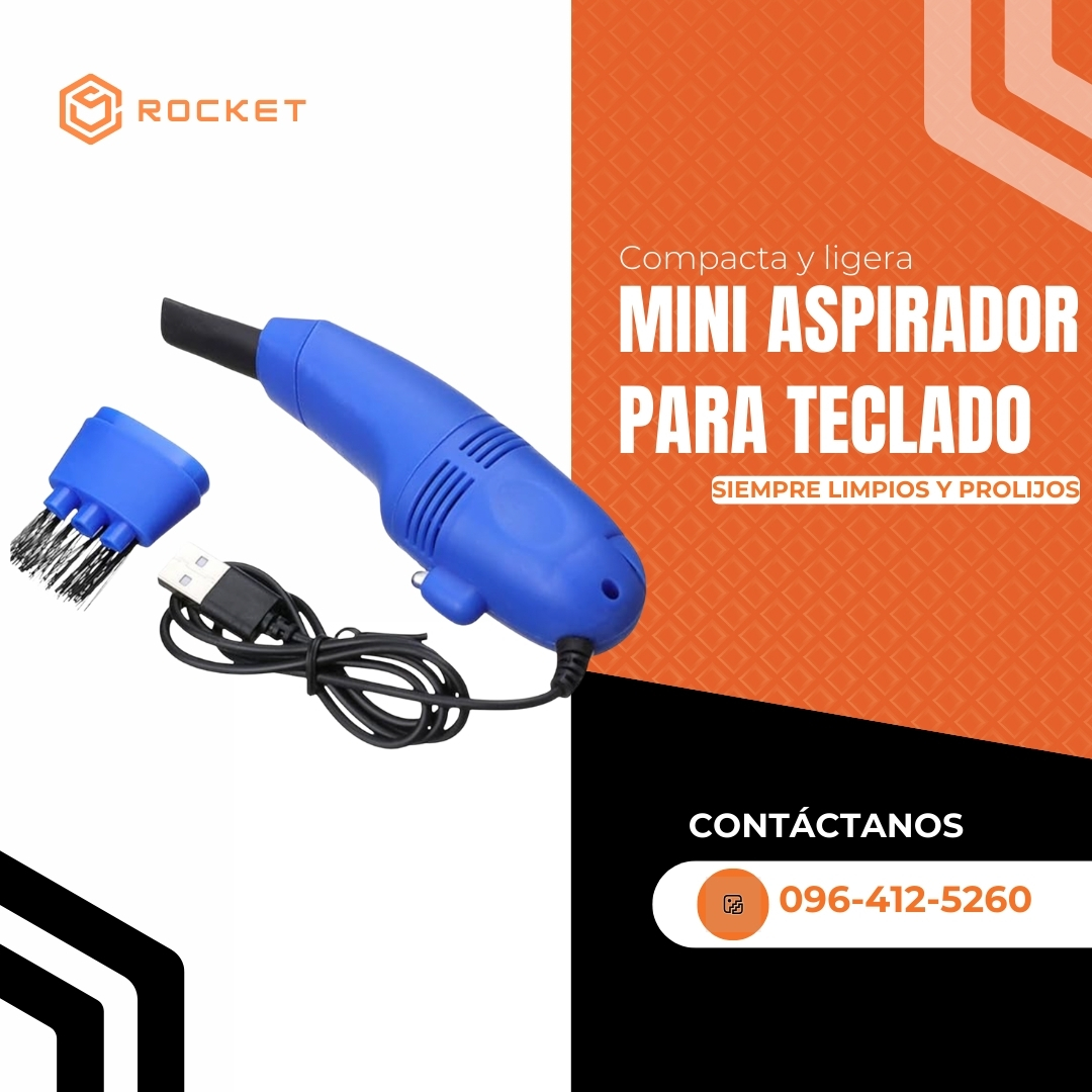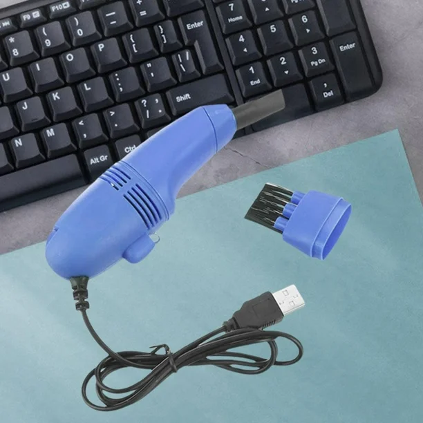 Mini aspiradora USB para teclado y laptop, compacta y ligera, ideal para limpiar polvo, migas y suciedad en teclados, ranuras y esquinas difíciles. Incluye boquilla delgada para llegar a espacios estrechos y un cepillo para desprender la suciedad sin rayar. Se conecta por USB y es perfecta para mantener tu escritorio, PC y accesorios siempre limpios y prolijos en casa u oficina.