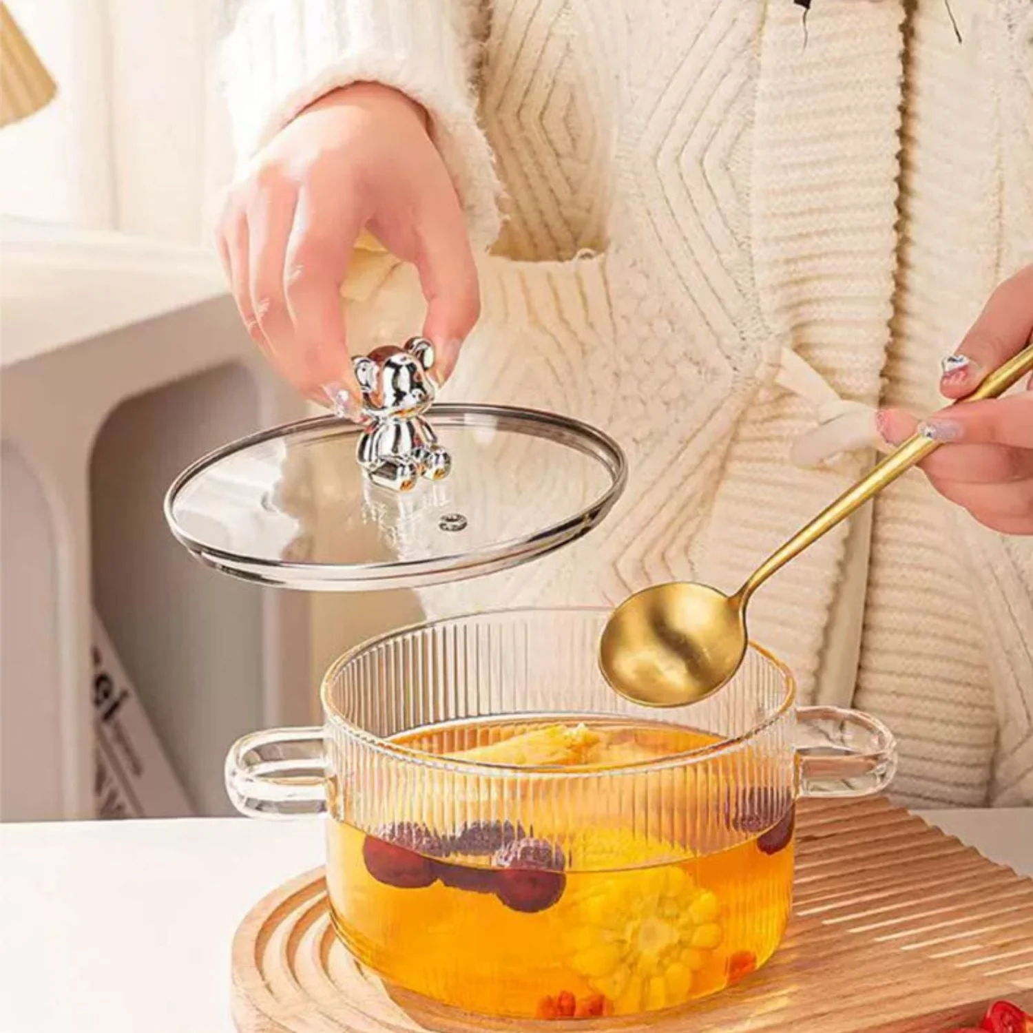 Dale un toque de sofisticación y ternura a tu cocina con nuestra olla de vidrio. Su cuerpo estriado y transparente no solo permite vigilar tus preparaciones en todo momento, sino que transforma cualquier receta en una experiencia visual increíble.