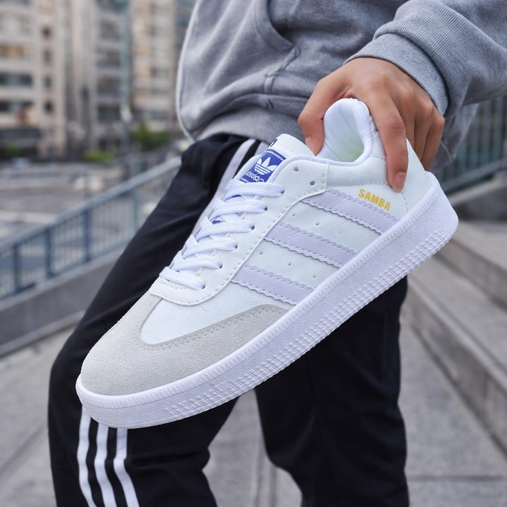 Parte superior (upper): Material tipo cuero sintético blanco, suave y resistente.