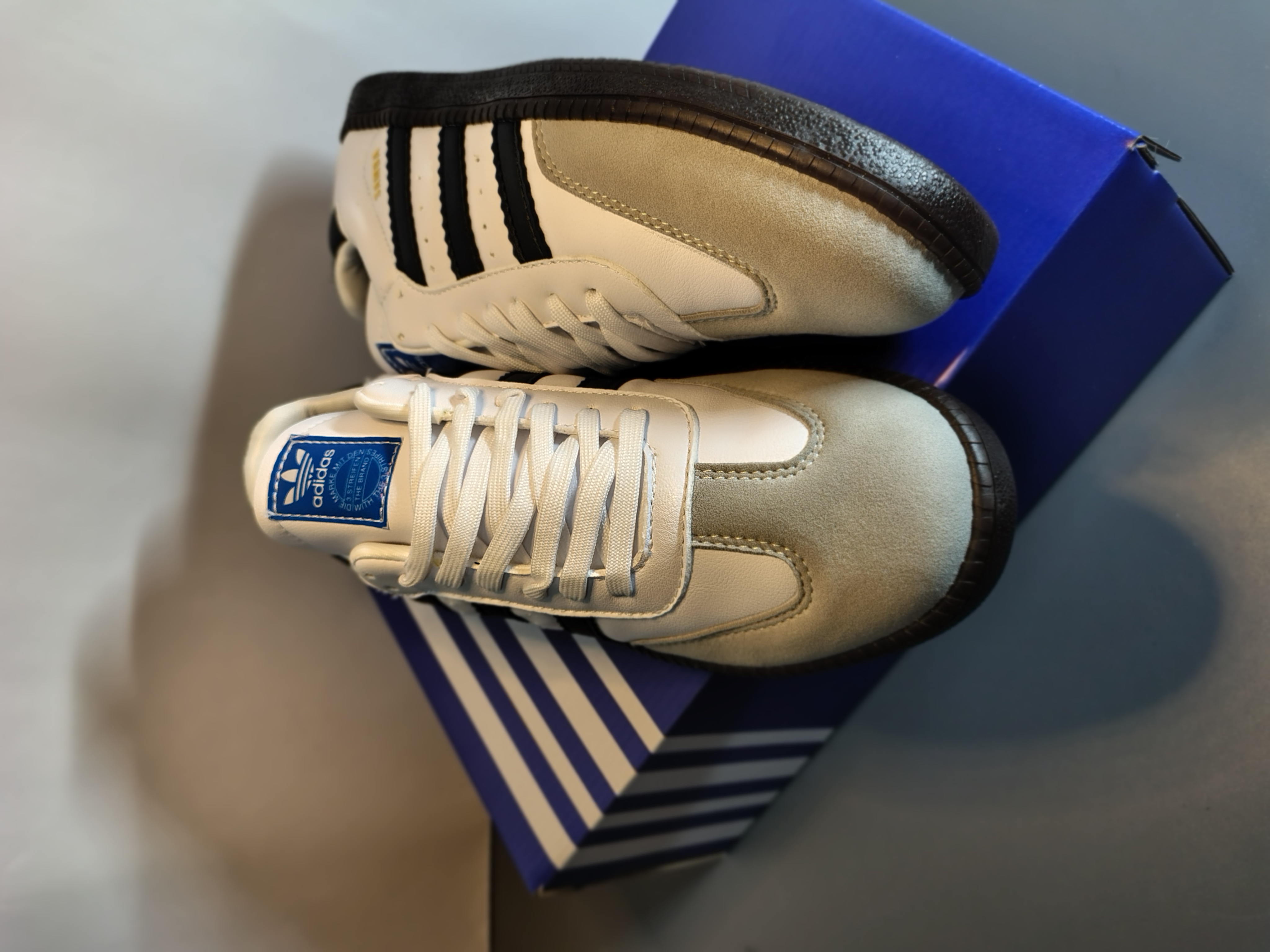 En el lateral externo se aprecia el detalle “Samba” en color dorado, un sello distintivo que resalta la historia y autenticidad del modelo. La lengüeta blanca incluye la etiqueta azul con el logo Trefoil de Adidas, aportando un toque retro muy valorado por los amantes del streetwear.