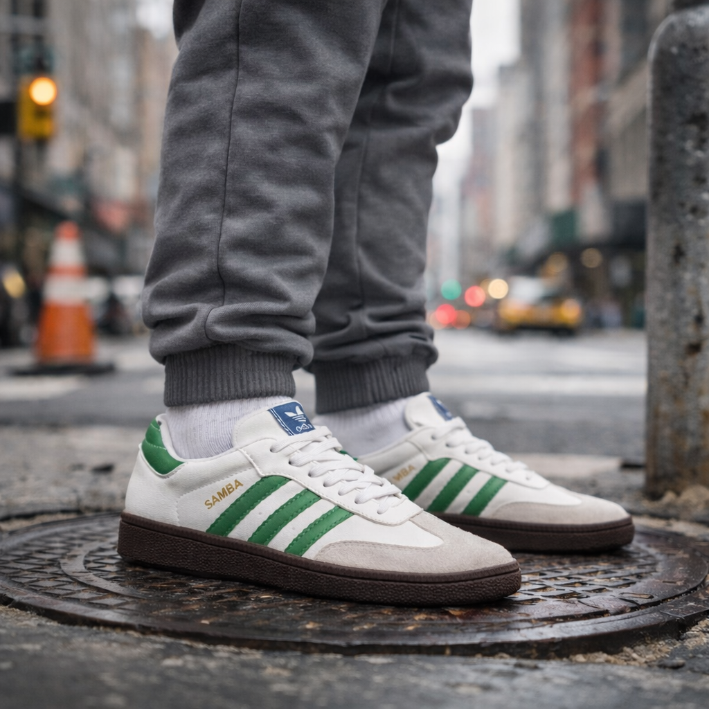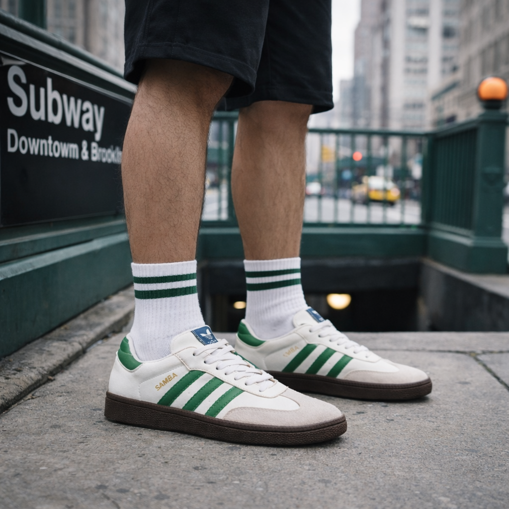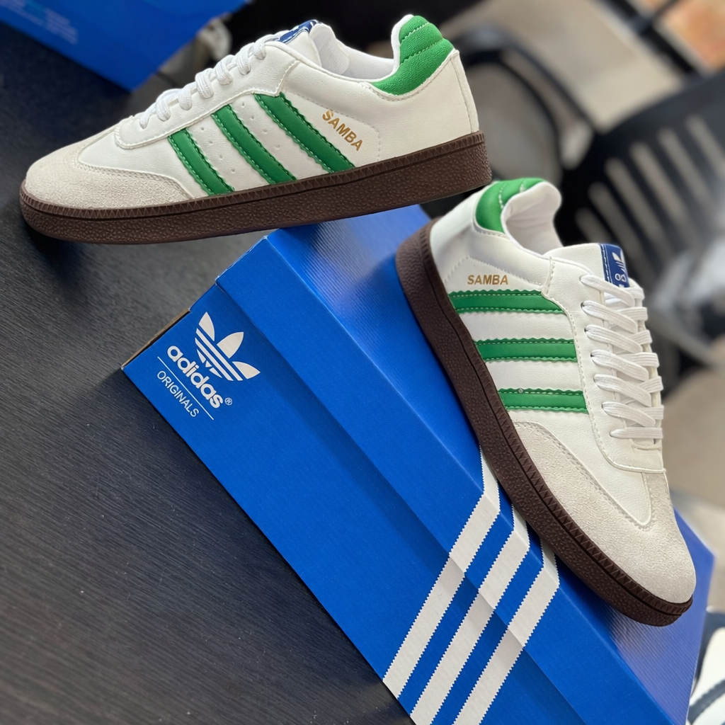 El diseño se inspira en el modelo original, con líneas limpias y elegantes que se adaptan tanto a estilos urbanos como deportivos. Las tres franjas verdes laterales añaden un detalle visual distintivo que realza el look general.