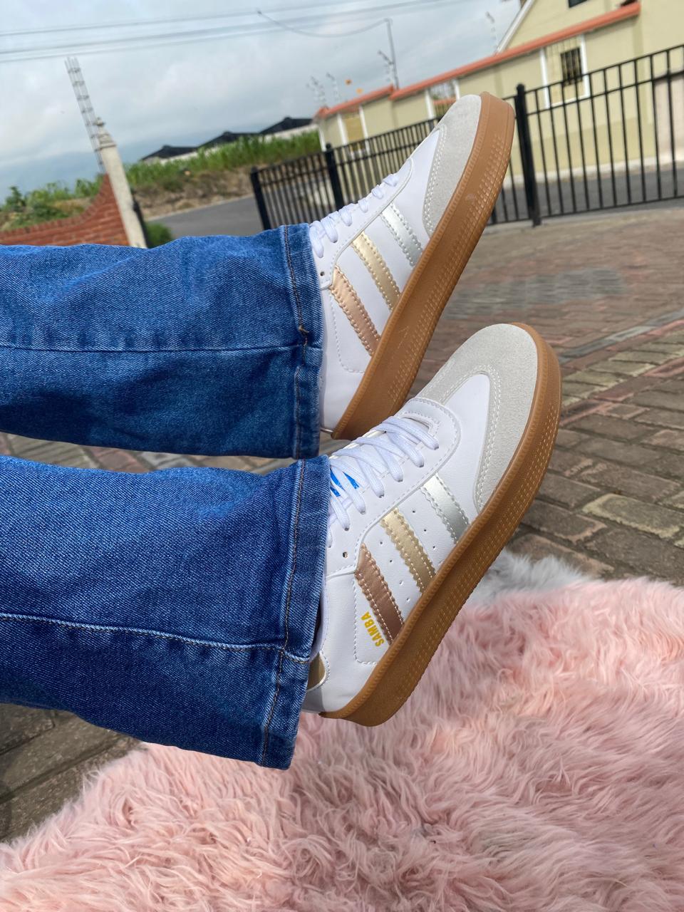Franjas laterales en tono metalizado rose-gold/cobre claro, que aportan un toque moderno y femenino sin perder la esencia clásica del modelo.